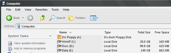 To find out how much space is left on your existing hard drive(s), as well as it's total size then you can open My Computer by double-clicking it from your desktop or selecting it from your Start Menu. If your view looks different from below, select the View menu at the top and then Details.